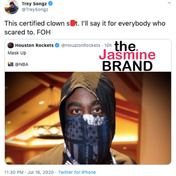 Now, Trey Songz has taken aim at Houston Rockets guard James Harden. The NBA team’s official Twitter posted a photo of James Harden on Thursday (July 16) night wearing what appears to be a #BlueLivesMatter face mask.