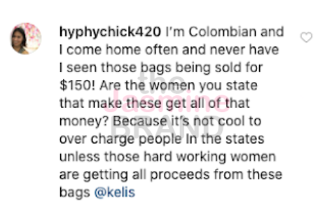 A fan from Colombia attempted to call Kelis out for selling these authentic purses for $150 when artists sell them for $40 in the streets of the South American country. The Instagrammer typed: