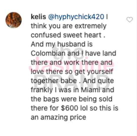 “I think you are extremely confused sweet heart. And my husband is Colombian and I have land there and work there and love there so get yourself together babe. And quite frankly I was in Miami and the bags were being sold there for $600 lol so this is an amazing price”