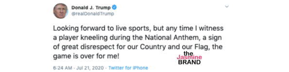 He took to Twitter on Tuesday (July 21st) after a number of sports players have shown their support for the Black Lives Matter movement by kneeling before their games.