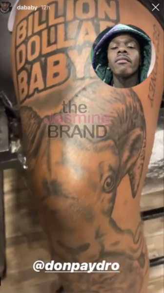 Rapper DaBaby (real name is Jonathan Lyndale Kirk), 28, has new ink and he’s not afraid to show it off! Da Baby debuted his new leg tattoos hours after celebrating six weeks at #1 on Billboard’s Hot 100 charts with his single “Rockstar”. Based on his video, Da Baby added several tattoos to both of his legs, including a portrait of a “friend”, animals, his brand, and what appears to be a baby version of himself.
