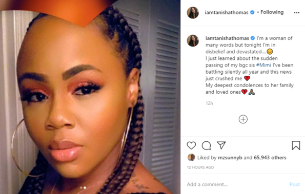 Veteran “Bad Girls Club” star and reunion host, Tanisha Thomas, reacted to MiMi’s death on Instagram: