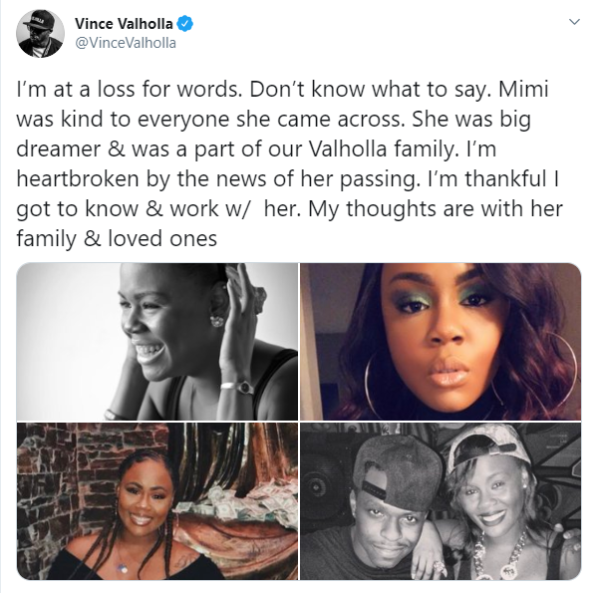 “I’m at a loss for words. Don’t know what to say. Mimi was kind to everyone she came across. She was big dreamer & was a part of our Valholla family. I’m heartbroken by the news of her passing. I’m thankful I got to know & work w/ her. My thoughts are with her family & loved ones.”