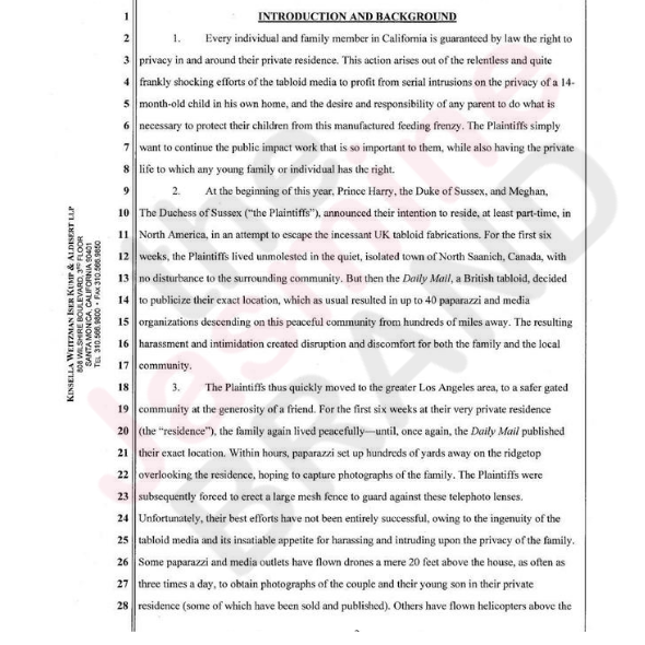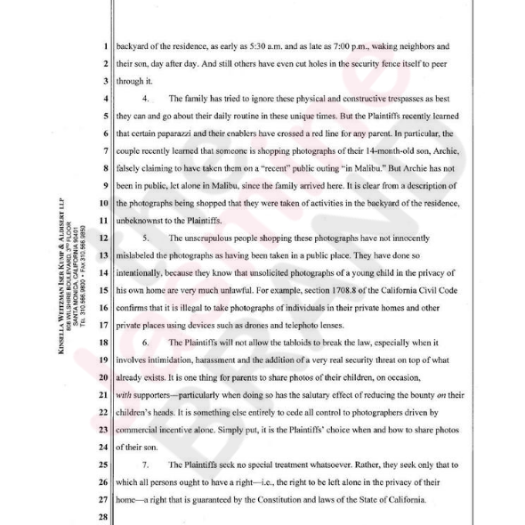“The family has tried to ignore these physical and constructive trespasses at best they can and go about their daily routine in these unique times. But the Plaintiffs recently learned that certain paparazzi and their enablers have crossed a red line for any parent. In particular, the couple recently learned that someone in shopping photographs of their 14-month-old son, Archie, falsely claiming to have taken them on a “recent” public outing “in Malibu.” But Archie has not been in public, let alone in Malibu, since the family arrived here. It is clear from a description of the photographs being shopped that they were taken of activities in the backyard of the residence, unbeknownst to the Plaintiffs.”