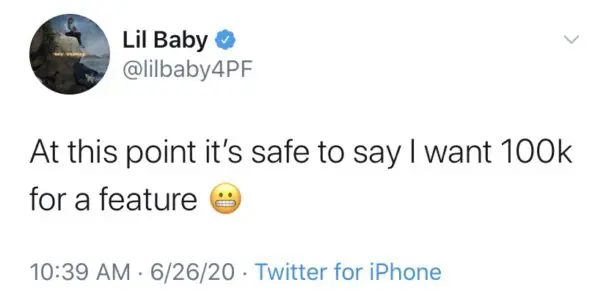 Celebrating a string of hits since 2018, Lil Baby isn’t accepting anything less than his desired rate for a feature on a fellow artist’s song. Lil Baby suggested he wants $100,000 in cold, hard cash for a verse. In a series of now-deleted tweets, he said: