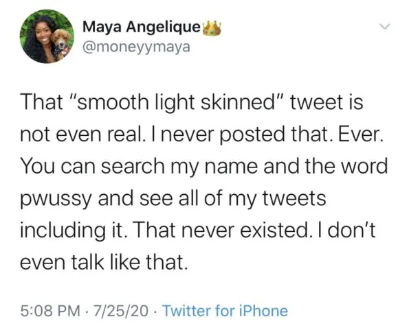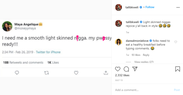 Talib Kweli was one of the many men mentioned in the tweet Maya Moody responded to. He responded and accused her of being divisive as a brown-skinned Black woman. This eventually led to weeks worth of open issues with Maya, including an alleged tweet of hers that Talib Kweli posted to his Instagram. He, in turn, accused her of subscribing to the color-struck rhetoric she addressed.