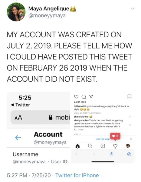 In fact, Maya says the tweet’s screenshot read that it had been created before her Twitter account was even active.