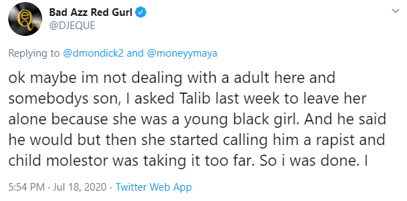 “If you have been active on twitter for the past week, you have probably seen the online harassment I have been receiving from Talib Kweli and his bots because of this tweet. This tweet was made to address colorism and desirability politics within the black community: specifically, amongst black entertainers. This was not an attempt to invalidate the blackness of light skinned people, but to bring awareness to the well-known fact: that black rappers, athletes and entertainers prefer to date and marry light skinned and nonblack women…With that being said, Talib Kweli has been on a week-long harassment spree directed at me via Twitter and Instagram…and they have been posting pictures of my parents online, who are ALL federal employees, along with their full names, where we live, and my stepmothers old job and salary…I am not the first or only victim of this behavior from Talbi Kweli…I have received DOZENS on messages from other victims, claiming he has harassed them and their families from anywhere between 2 weeks to OVER 3 YEARS!”