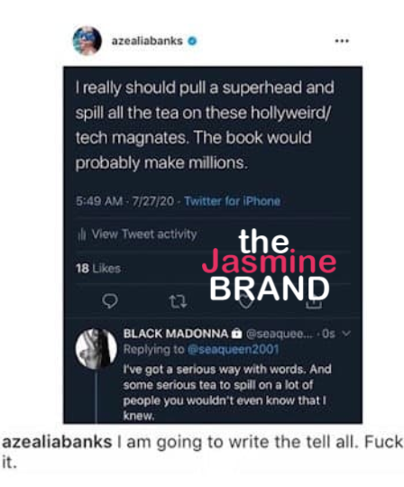 In a now-deleted post, Azealia Banks has threatened to write a tell-all book. Her post read,