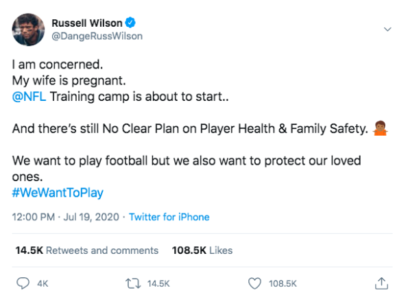 “I am concerned. My wife is pregnant. @NFL Training camp is about to start..And there’s still No Clear Plan on Player Health & Family Safety. We want to play football but we also want to protect our loved ones. #WeWantToPlay”