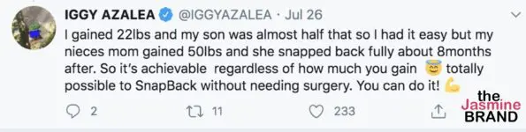 The new mom has been very candid with her fans about getting back to her pre-baby weight after giving birth to Onyx. When one Twitter follower told the rapper that she was scared of having a second child due to weight gain, Iggy Azalea responded: