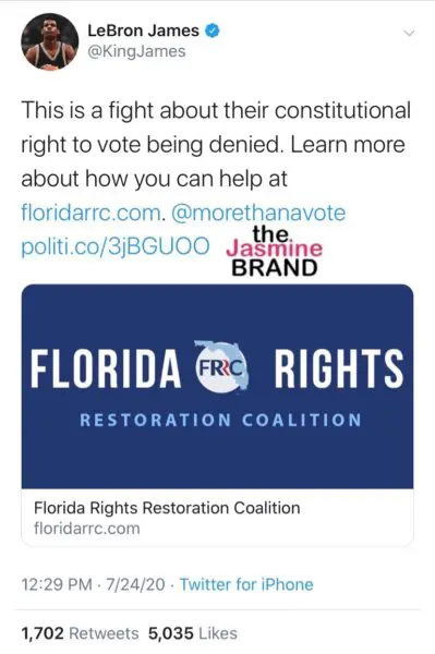 NBA superstar, LeBron James is putting his money where his mouth is.  On Friday (July 24), his “More Than A Vote” initiative committed $100,000 to the Florida Rights Restoration Coalition to help felons regain their constitutional right to vote. LeBron James announced on Twitter,