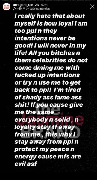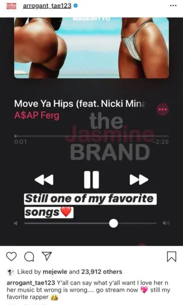 Arrogant Tae later added a post on his Instagram expressing that he still loves Nicki Minaj and her music and she’s still his favorite rapper while promoting her song.