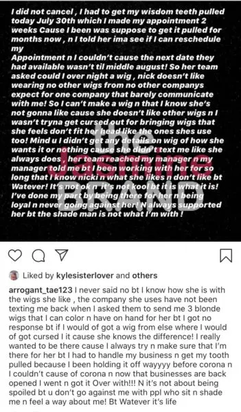 She continued to explain that Arrogant Tae cancelled on her 48 hours before the shoot so she requested that he overnight the wig to her. Nicki Minaj alleges that when it got down to the wire, 24 hours before the shoot, she thankfully had someone who could come and accommodate her.