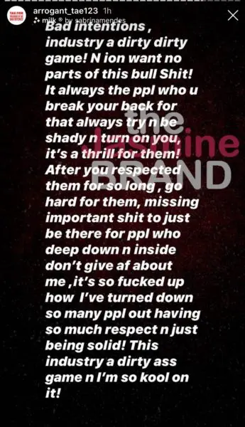 Arrogant Tae went on to respond to Minaj’s allegations claiming that he didn’t cancel, but in fact had to get his wisdom teeth pulled. He posted his explanation with an Instagram post and added a few extra thoughts via his IG stories. (Read below)