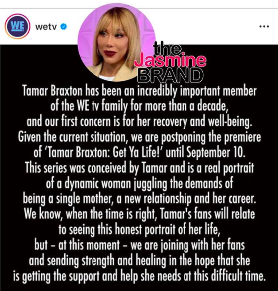 In recent Tamar news, as the singer is currently hospitalized, WeTv made the decision to postpone the season premiere of her new show “Tamar Braxton: Get Ya Life!”
