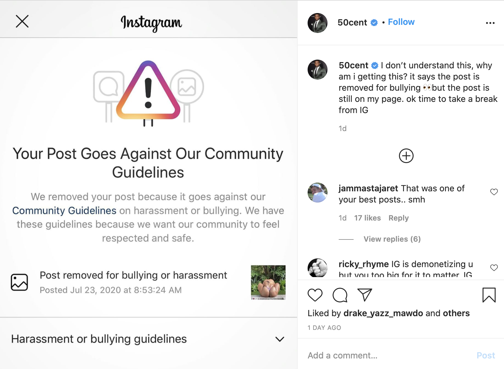 Rapper and television producer 50 Cent is allegedly planning on taking a break from Instagram after he became upset that the social media platform reported one of his latest posts. 50 Cent reposted the notification he got when his post “violated community guidelines” and wrote,