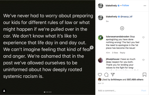 “We’re ashamed that in the past we’ve allowed ourselves to be uninformed about how deeply rooted systemic racism is. We’ve been teaching our children differently than the way our parents taught us. We want to educate ourselves about other people’s experiences and talk to our kids about everything, all of it… especially our own complicity.”