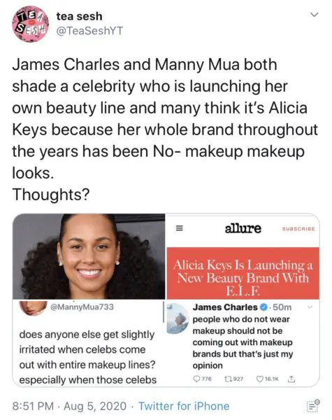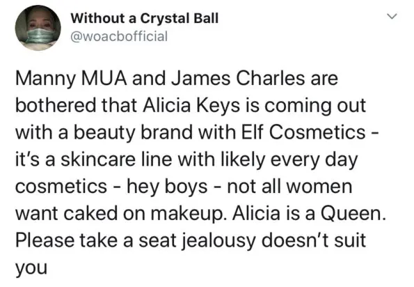 But no win comes without heckling from competition in the stands. Fans pointed out a tweet from beauty guru James Charles, suspecting it to be a shot at Alicia Keys’ latest endeavor: