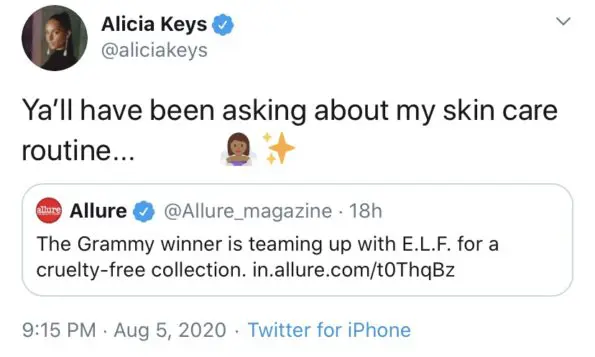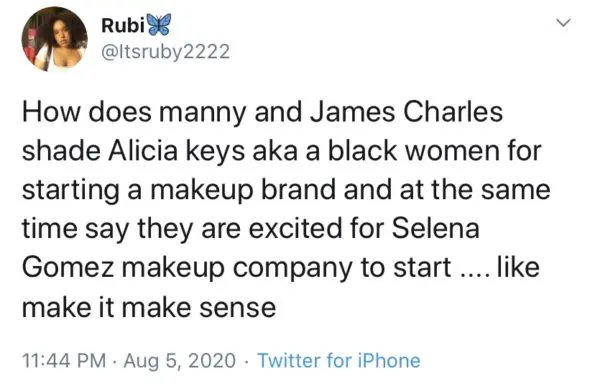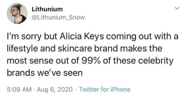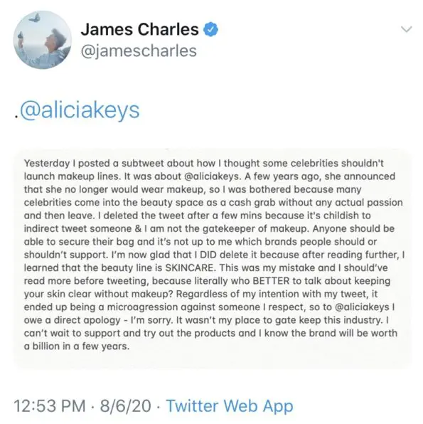 “Yesterday I posted a subtweet about how I thought some celebrities shouldn’t launch makeup lines. It was about @aliciakeys. A few years ago, she announced that she no longer would wear makeup, so I was bothered because many celebrities come into the beauty space as a cash grab without any actual passion and then leave…I’m sorry. It wasn’t my place to gate keep this industry.”