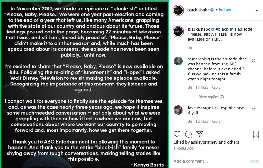 In November 2017, we made an episode of “black-ish” entitled “Please, Baby, Please.” We were one year post-election and coming to the end of a year that left us, like many Americans, grappling with the state of our country and anxious about its future. Those feelings poured onto the page, becoming 22 minutes of television that I was, and still am, incredibly proud of. “Please, Baby, Please” didn’t make it to air that season and, while much has been speculated about its contents, the episode has never been seen publicly… until now.I’m excited to share that “Please, Baby, Please” is now available on Hulu. Following the re-airing of “Juneteenth” and “Hope,” I asked Walt Disney Television to revisit making the episode available. Recognizing the importance of this moment, they listened and agreed.I cannot wait for everyone to finally see the episode for themselves and, as was the case nearly three years ago, we hope it inspires some much-needed conversation — not only about what we were grappling with then or how it led to where we are now, but conversations about where we want our country to go moving forward and, most importantly, how we get there together.Thank you to ABC Entertainment for allowing this moment to happen. And thank you to the entire “black-ish” family for never shying away from tough conversations, making telling stories like this possible.-Kenya Barris