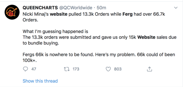 “Nicki Minaj’s website pulled 13.3k Orders while Ferg had over 66.7k Orders. What I’m guessing happened is The 13.3k orders were submitted and gave us only 15k Website sales due to bundle buying. Fergs 66k is nowhere to be found. Here’s my problem. 66k could of been 100k+.”