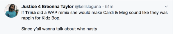 Trina is a trending topic on after fans speak out on the criticism over Cardi B and Megan the Stallion‘s lyrics in their recently released song “WAP”.
