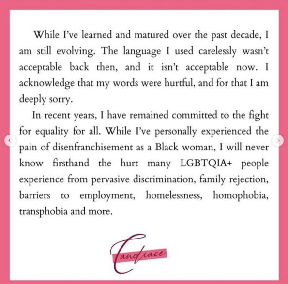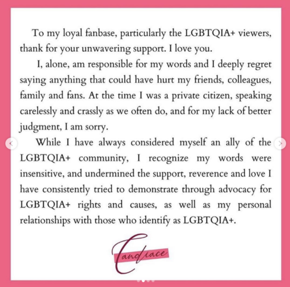 “To my loyal fanbase, particularly the LGBTQIA+ viewers, thank you for your unwavering support. I love you. I, alone, am responsible for my words and I deeply regret saying anything that could have hurt my friends, colleagues, family and fans. At the time I was a private citizen, speaking carelessly and crassly as we often do, and for my lack of better judgment, I am sorry.While I have always considered myself an ally of the LGBTQIA+ community, I recognize my words were insensitive, and undermined the support, reverence and love I have consistently tried to demonstrate through advocacy for LGBTQIA+ rights and causes, as well as my personal relationships with those who identify as LGBTQIA+.While I’ve learned and matured over the past decade, I am still evolving. The Language I used carelessly wasn’t acceptable back then, and it isn’t acceptable now. I acknowledge that my words were hurtful, and for that, I am deeply sorry. In recent years, I have remained, I have remained committed to the fight for equality for all. While I’ve personally experienced the pain of disenfranchisement as a Black woman, I will never know firsthand the hurt many LGBTQIA+ people experience from pervasive discrimination, family rejection, barriers to employment, homelessness, homophobia, transphobia and more.I am truly sorry for my comments and I only ask for patience and understanding as I strive to evolve as a person.”