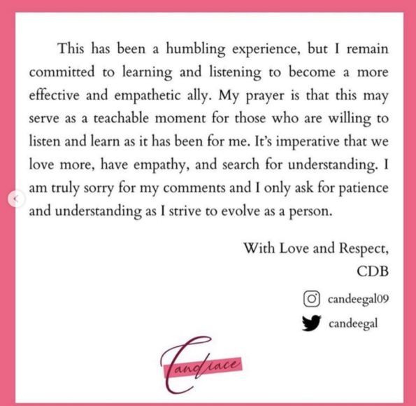 After the tweets were discovered and fans began calling for Bravo to fire the 33 year old, she has come out in support of the LGBTQ+ community and apologized for the comments that she made. In a statement, Candiace Dillard wrote,