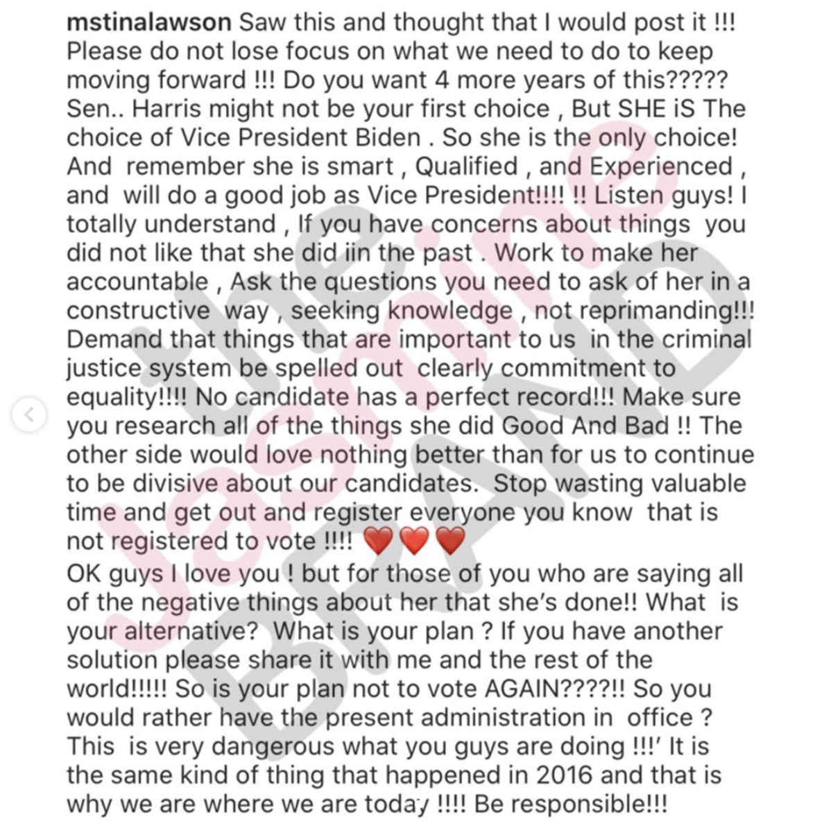 “There is no debate anymore. There’s no room for it in my book. We either make this happen. Or literally, more of us perish. People are dying. Someone I love died. This virus is real. If it hasn’t visited your doorstep, it will. Oh but, Kamala did this or she didn’t do that. I hear you. I know. And I don’t care. Because what she DIDN’T DO is abandon citizens in a pandemic, rip babies from their mother’s arms at the border, send federal troops to terrorize protestors, manufacture new ways to suppress Black and Brown votes, actively disrespect Indigenous people and land, traffic in white supremacist rhetoric in an effort to stir racist violence at every turn, attempt to dismantle most American democratic systems of checks and balance, degrade women all day everyday, infect the Supreme Court with another misogynist hack, demolish America’s standing on climate, actively cultivate and further white supremacist structures and systems across all aspects of American daily life. I mean, that’s what she DIDN’T do. So I don’t wanna hear anything bad about her. It doesn’t matter to me. Vote them in and then let’s hold them accountable. Anything other than that is insanity. It’s ego. It’s against our own interests. It’s selfish. It’s disrespectful to our elders. It’s nonsense. It’s talking to hear yourself talk. This is a matter of life or death. We need all our energy focused. This is a fight for more than can be expressed here. There is no debate anymore. Not for me anyway. #voteblue2020”