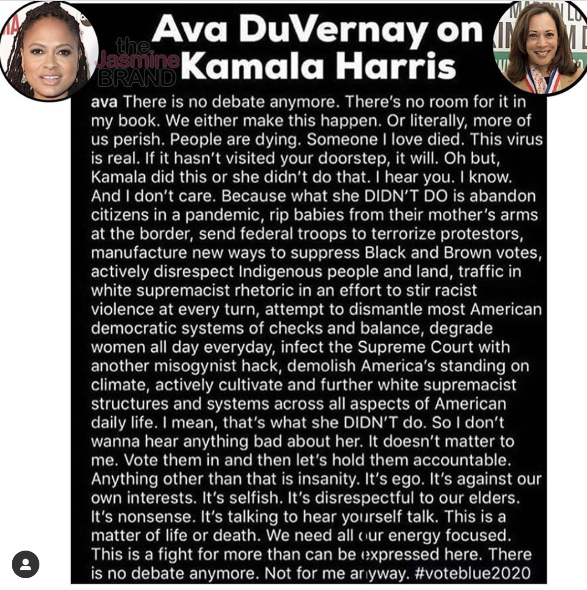 Director Ava DuVernay also echoed a similar sentiment as Ms. Tina, coming to the defense of Kamala Harris, stating that there is “no debate anymore”,