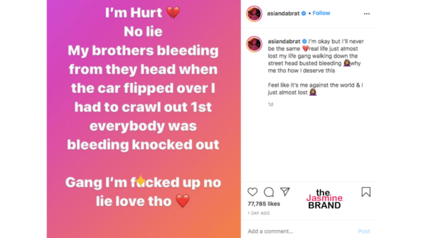 “I’m hurt, no lie. My brothers bleeding from they head when the car flipped over I had to crawl out 1st everybody was bleeding knocked out. Gang, I’m f*cked up, no lie. love tho.”