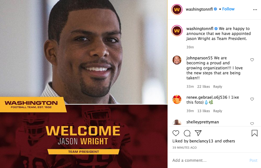The Washington Football Team has announced it’s new president, Jason Wright. The former NFL running back is the first ever black NFL team president. The team announced the news on social media writing: