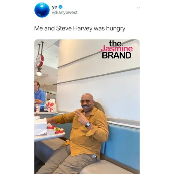 Looks like Kanye West spent the afternoon, having lunch with Steve Harvey at Chik-Fil-A. Today (August 18th), the 43-year-old rapper shared an image of the 63-year-old comedian and talk show host. He tweeted: