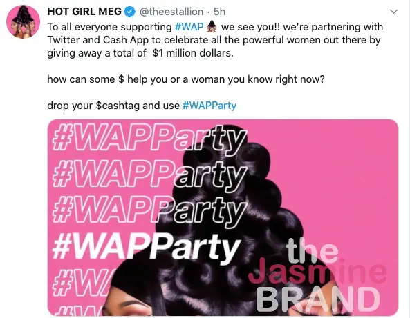 Megan Thee Stallion and Cardi B are still flying high from their single “WAP” hitting the No.1 spot, and now they’re sharing the celebration with their fans on Twitter. The two heavy-hitter rappers partnered with the social media company and financial service giant, Cash App to celebrate their hit single and donate $1 million dollars to ‘powerful women’.