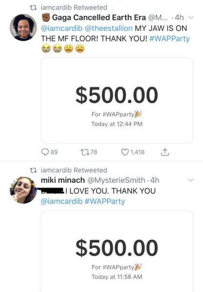 Both rappers made the announcement on Twitter and it wasn’t long before fans started posting the receipts of payments they were receiving. Check out some of the recipients below!