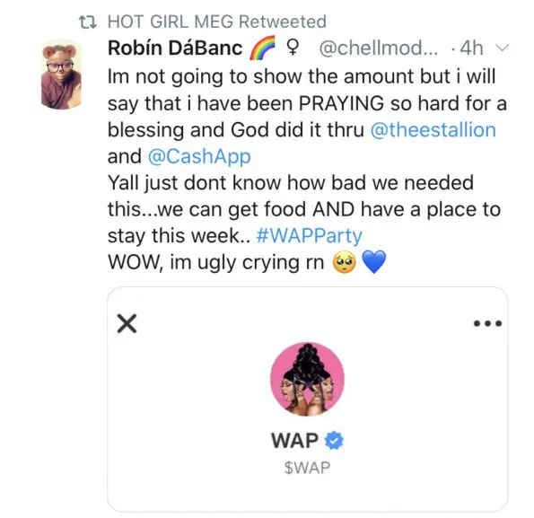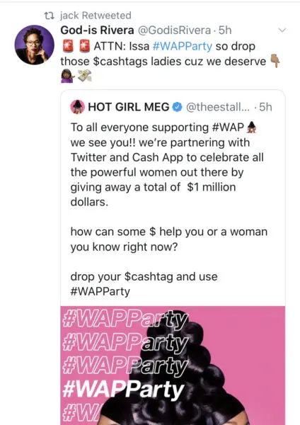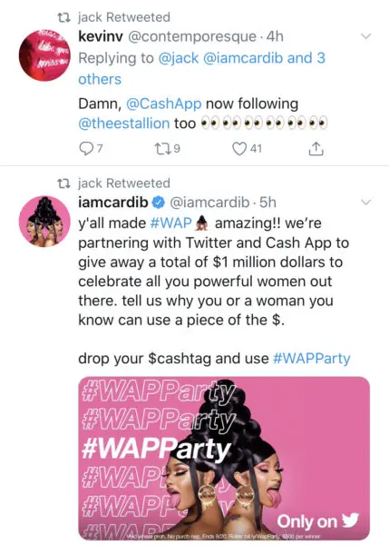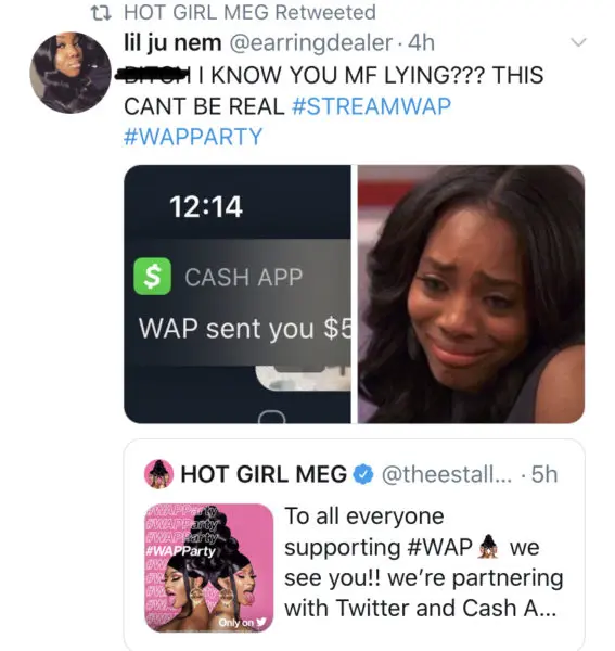 Megan Thee Stallion and Cardi B are still flying high from their single “WAP” hitting the No.1 spot, and now they’re sharing the celebration with their fans on Twitter. The two heavy-hitter rappers partnered with the social media company and financial service giant, Cash App to celebrate their hit single and donate $1 million dollars to ‘powerful women’.