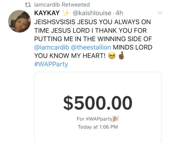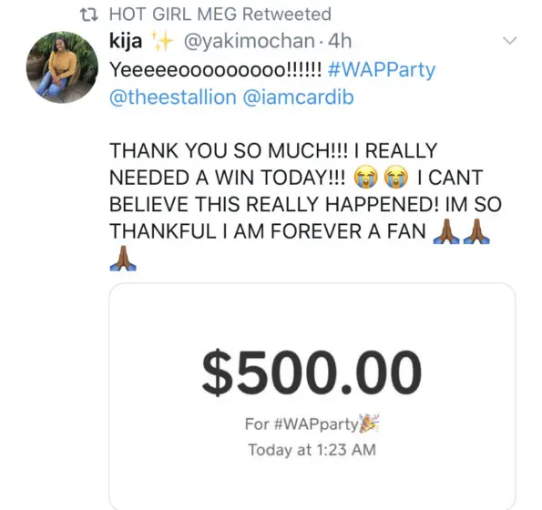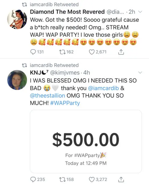 Both rappers made the announcement on Twitter and it wasn’t long before fans started posting the receipts of payments they were receiving. Check out some of the recipients below!