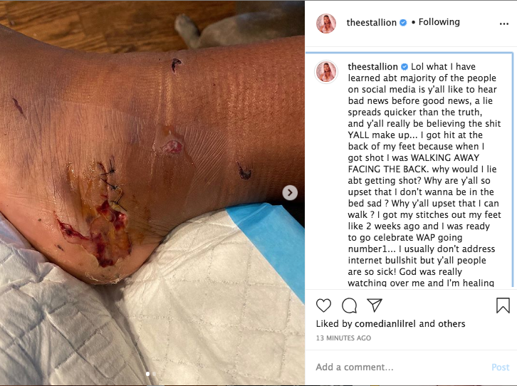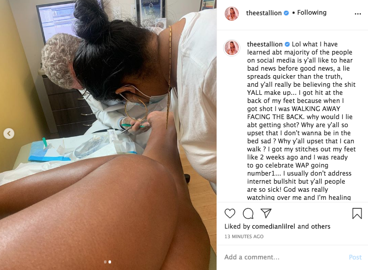 I got my stitches out my feet like 2 weeks ago and I was ready to go celebrate WAP going number1… I usually don’t address internet bullsh*t but y’all people are so sick! God was really watching over me and I’m healing so well! Sorry I’m not as sad and miserable as a lot of y’all lol but ima keep being Megan Thee Mf STALLION