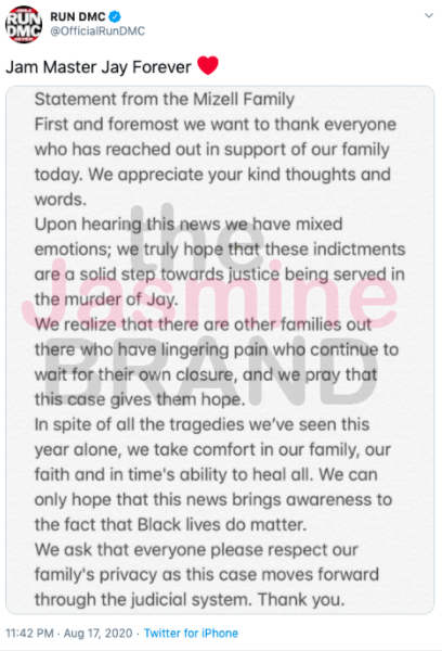 Just hours after the two men were indicted on murder charges for Jam Master Jay, a family member released a statement through the official RUN D.M.C. page.