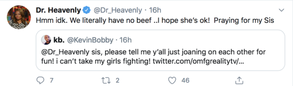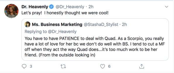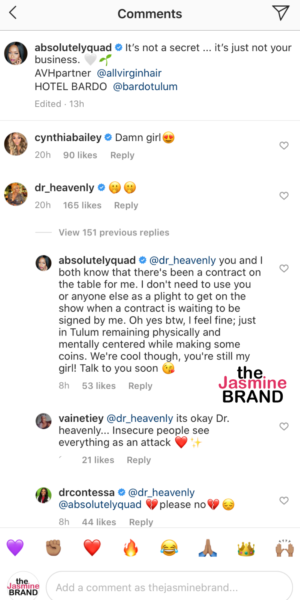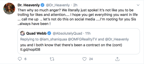 The conversation continued online when Dr. Heavenly posted and deleted a message alluding to Quad Webb starting drama to try and get back on the Bravo reality show. At the same time, she clarified there’s no issue between them.