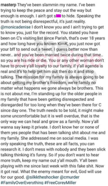 “I went and seen who he’s following and what he was saying, some of the stuff don’t even look like he wrote it… Everything our family worked for, our reputation, just because somebody incarcerated say whatever it’s entertainment to the world. This is not entertainment, it’s not funny. This is hurtful.”