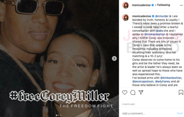 C-Murder, whose real name is Corey Miller, was arrested in 2002 for the murder of a 16-year-old boy, Steve Thomas. C-Murder and his family have maintained his innocence, and earlier this month, Monica revealed that she’s working with Kim Kardashian West to get him released.