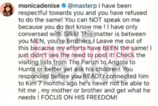 “I have been respectful towards you and you have refused to do the same! You can NOT speak on me because you do not know me! I have only conversed with Silkk! This matter is between you MEN, you’re brothers! Leave me out of this because my efforts have BEEN the same! I just didn’t see the need to post it! Check the visiting lists from The Parish to Angola to Hunts or better yet ask his children!”