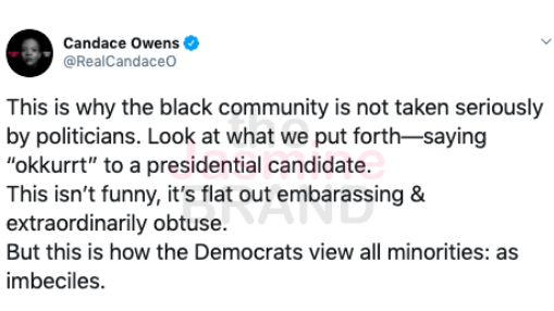 “This is why the black community is not taken seriously by politicians. Look at what we put forth—saying “okkurrt” to a presidential candidate. This isn’t funny, it’s flat out embarassing & extraordinarily obtuse. But this is how the Democrats view all minorities: as imbeciles.”