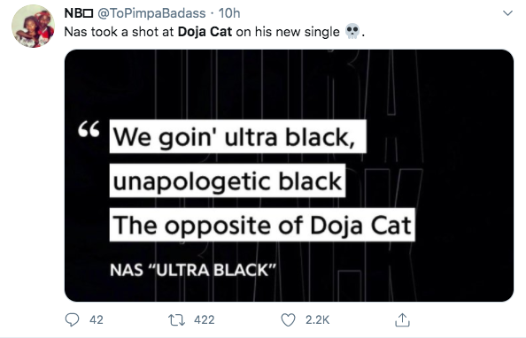 Original Story (Aug. 14th): Rapper Nas doesn’t seem to be a fan of fellow rapper Doja Cat. On August 14th Nas, born Nasir bin Olu Dara Jones, released a new single called Ultra Black, and unapologetically name-dropped Doja Cat. He raps,