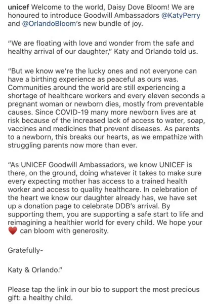 “As UNICEF Goodwill Ambassadors, we know UNICEF is there, on the ground, doing whatever it takes to make sure every expecting mother has access to a trained health worker and access to quality healthcare. In celebration of the heart we know our daughter already has, we have set up a donation page to celebrate DDB’s arrival. By supporting them, you are supporting a safe start to life and reimagining a healthier world for every child. We hope your ?? can bloom with generosity.?