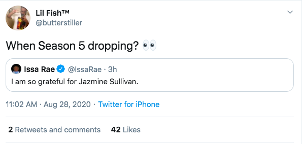 Issa Rae’s hit show Insecure is something many people have become obsessed with since it initially premiered back in 2016. Even though season 4 ended in June of this year, it seems that Issa Rae’s fans are already growing impatient with waiting for season 5. One fan responded to a tweet Issa Rae sent out expressing her appreciation for American singer Jazmine Sullivan and asked,