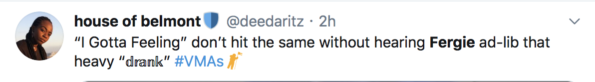 THEY REALLY DOING I GOTTA FEELING WITHOUT FERGIE IM DONE IM DONE #VMAs https://t.co/oElrCsDUFr