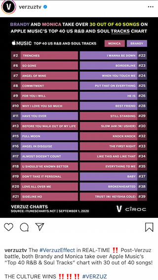 “This was a beautiful moment @monicadenise had a blast with you on @verzuztv … we riding dem charts on @applemusic too .. I see us it was an honor Thank you stars and doves for your forever support. Love y’all”